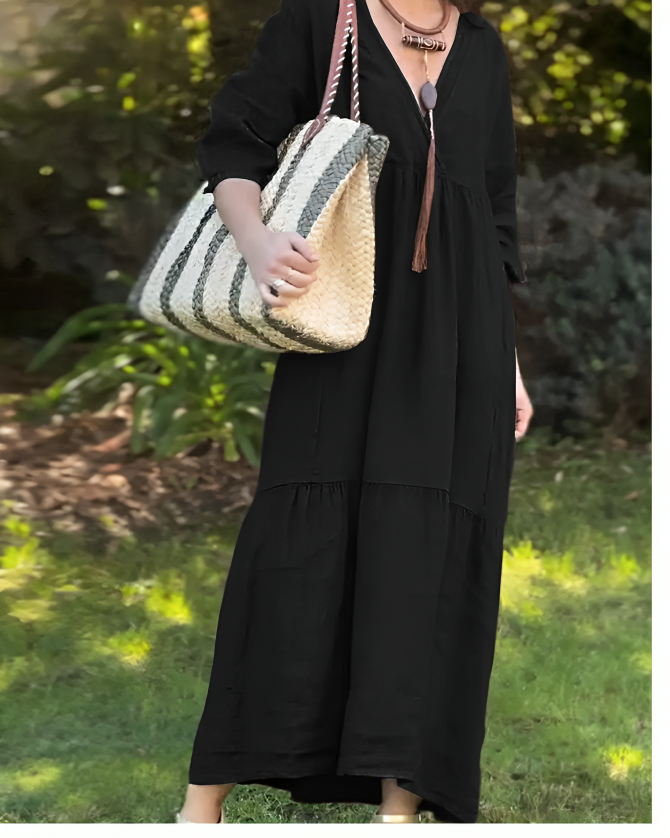 Crafted from pure 100% cotton, this dress embodies understated sophistication with a naturally breathable finish. The V-neckline frames the collarbone with subtle elegance, while the 3/4 sleeves strike the perfect balance between comfort and refined style. Designed with a relaxed yet flattering fit, it drapes gracefully along the silhouette, offering ease of movement without compromising on polish. A side pocket adds a thoughtful, functional detail, enhancing its versatility for everyday wear.